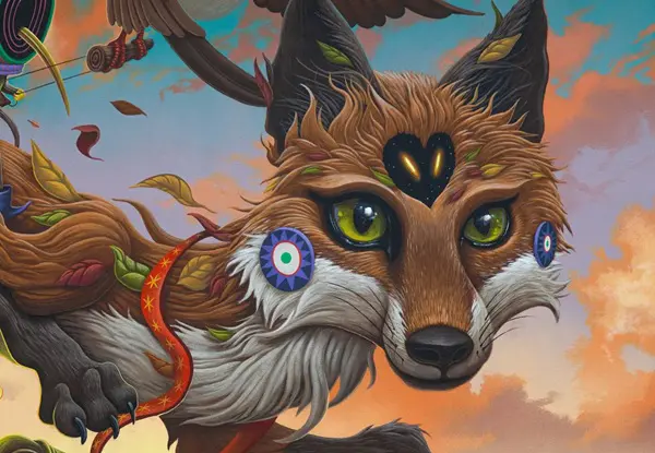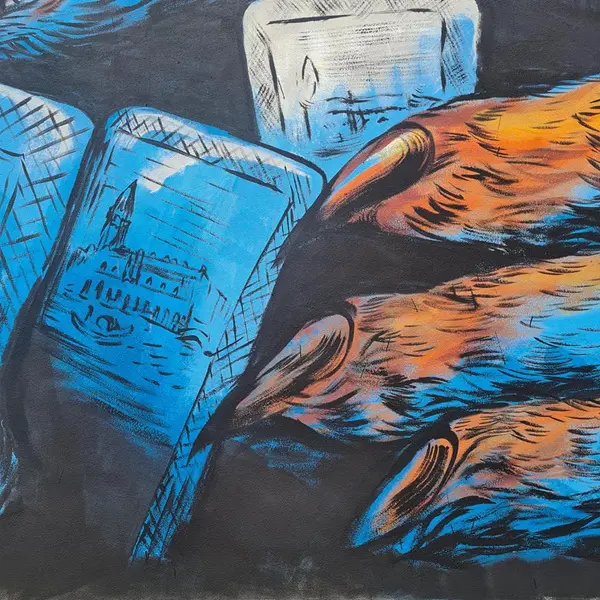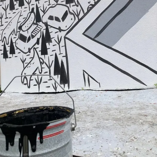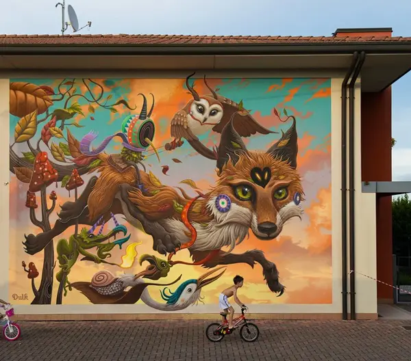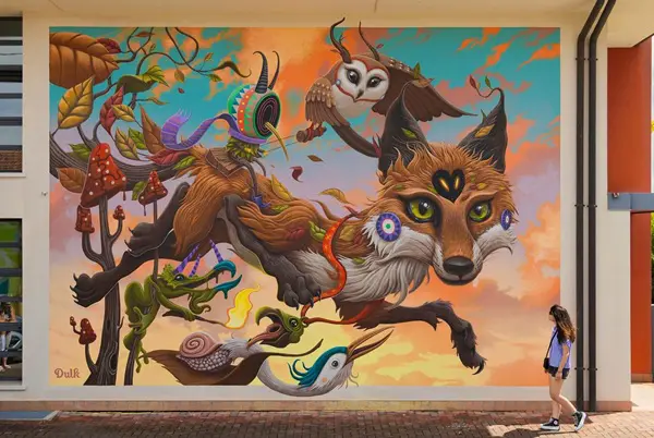 Kleuren, surrealisme en natuur komen samen in de karavaan van de vos en andere dieren op zoek naar een nieuwe plek om te wonen, in een prachtige muurschildering van Dulk.