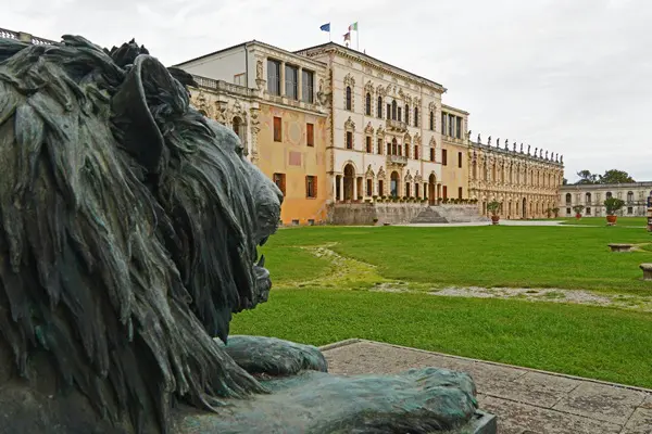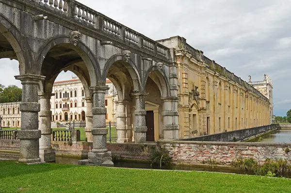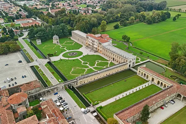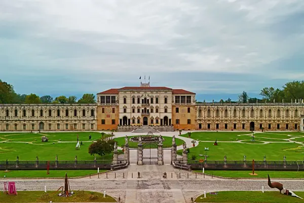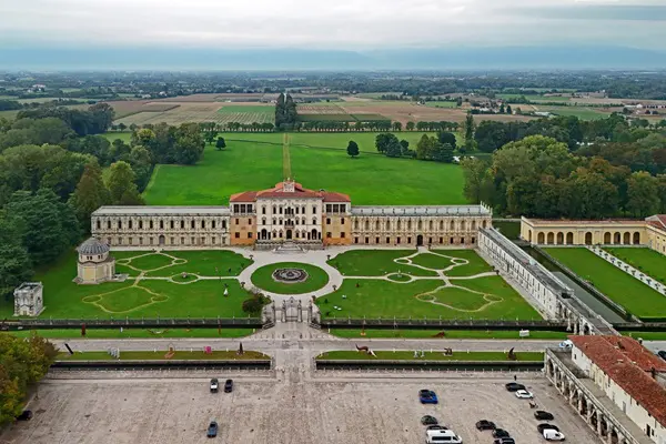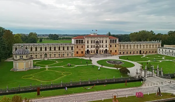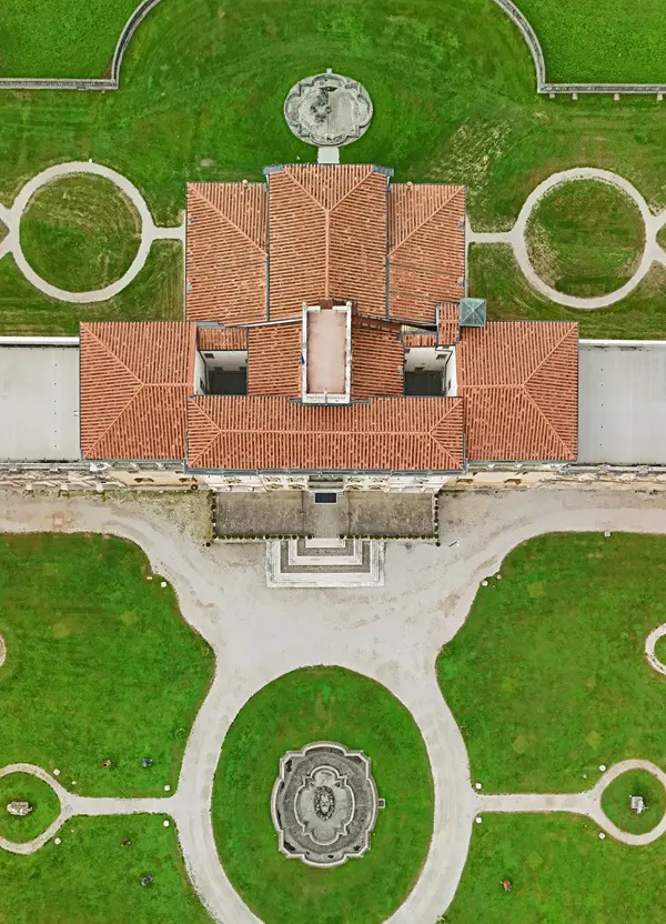 Hier zie je meteen hoe gigantisch de villa is en dat het complex uit verschillende periodes stamt. Het centrale deel werd in 1546 gebouwd in opdracht van Paolo en Francesco Contarini. Voor het ontwerp tekende zeer waarschijnlijk de beroemde architect Andrea Palladio.