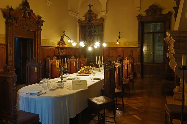 Vanuit het auditorium heb je prachtig uitzicht over het enorme park, met een oppervlakte van maar liefst veertig hectare, en een aantal kamers met onder meer de stijlvol ingerichte eetkamer.