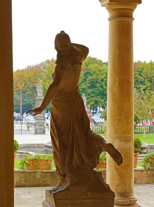 We passeren de overdekte loggia met een mooi uitzicht op het grote plein aan de overzijde van de tuin.
