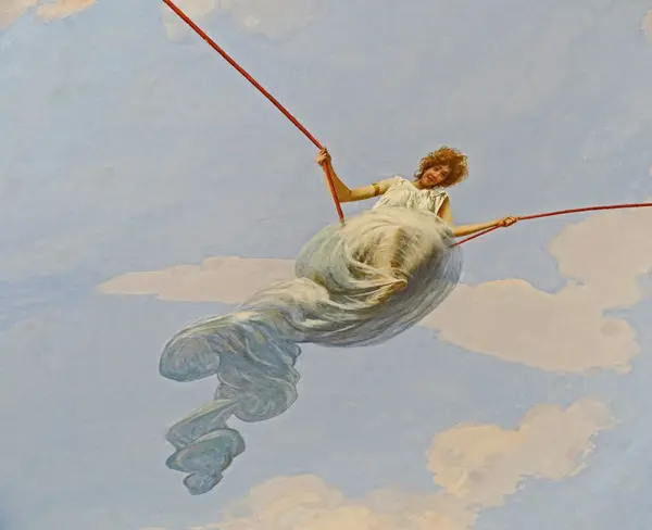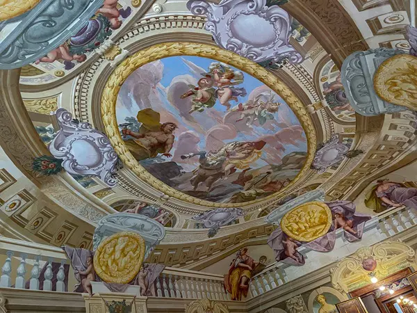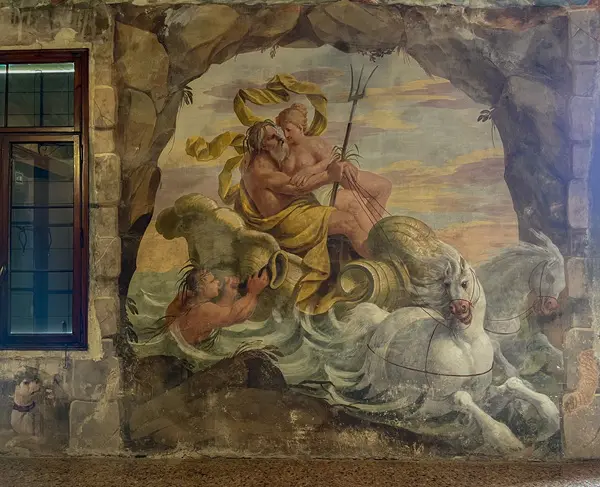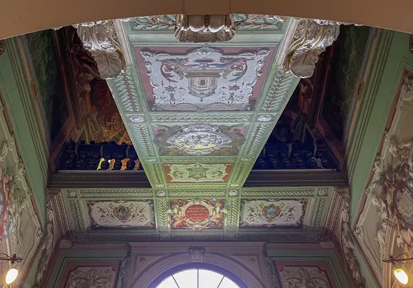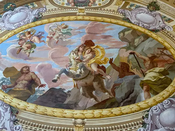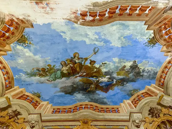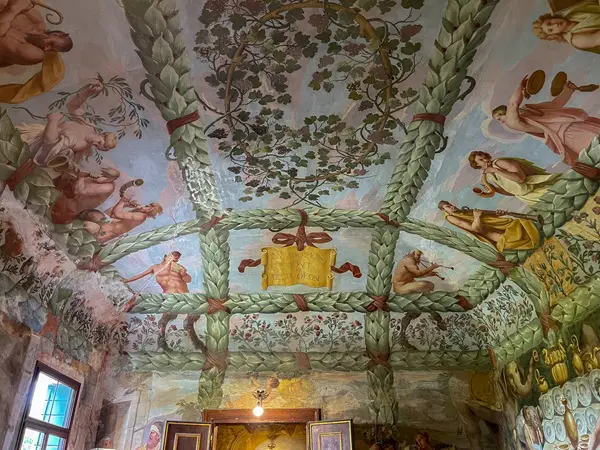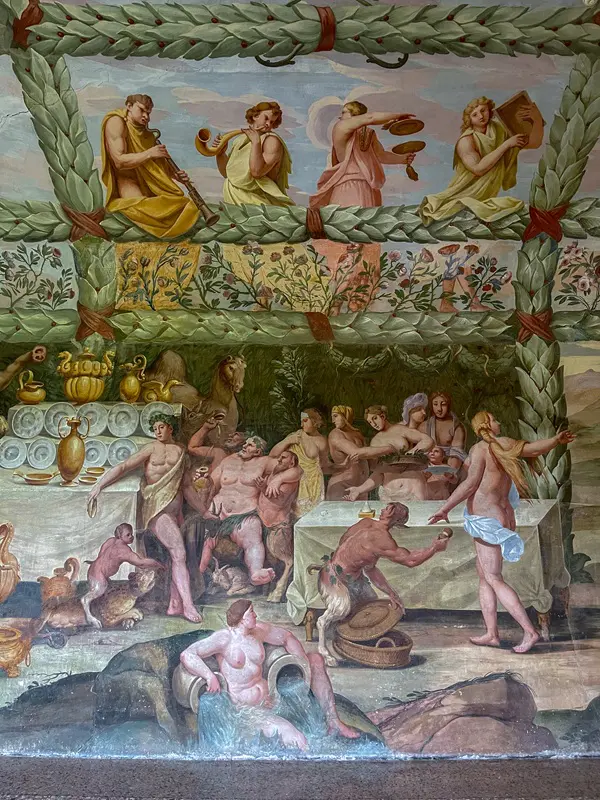 De fresco’s brengen bijbelse en mythologische thema’s tot leven, maar ook jachttaferelen, mozaïeken en perspectiefeffecten, allemaal ter vermaak van de gasten.