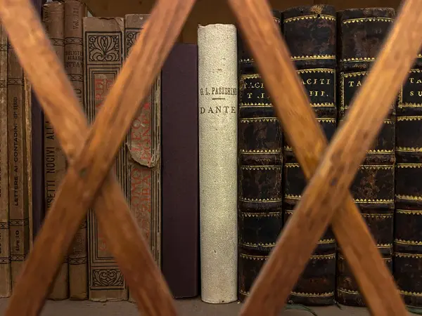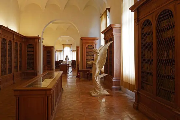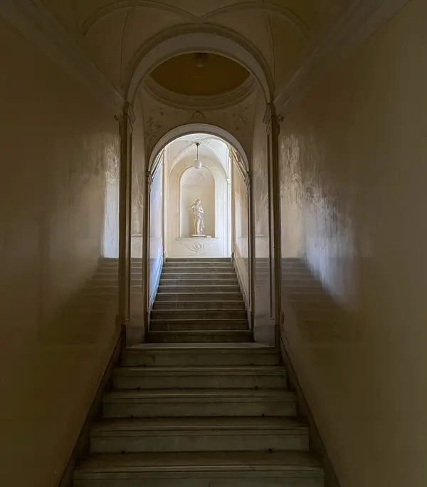 We lopen via de trap in het Atrio Pompeiano, waar de fresco’s zijn geïnspireerd op de grottesche die zijn gevonden in de Domus Aurea in Rome, naar de tweede verdieping waar zich een uitgestrekte bibliotheek bevindt.
