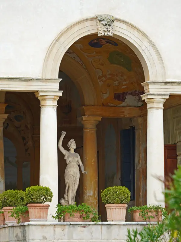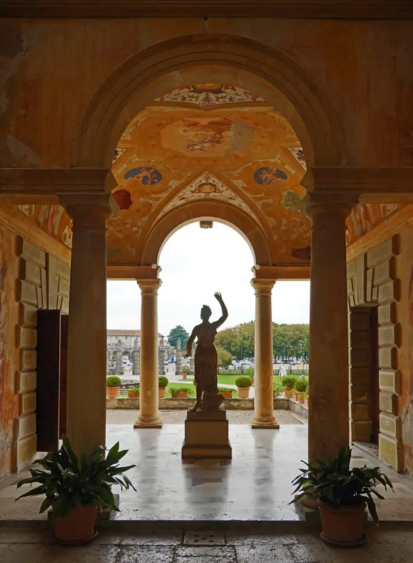 Erwin: ‘Wanneer je het dorpje Piazzola sul Brenta binnenrijdt, kom je al snel op de met grote magnolia’s omzoomde Viale Silvestro Camerini. Deze statige laan brengt je naar het enorme halfronde, deels door zuilen omarmde Piazza Paolo Camerini, dat tegenwoordig dienstdoet als parkeerplaats voor de bezoekers van Villa Contarini.