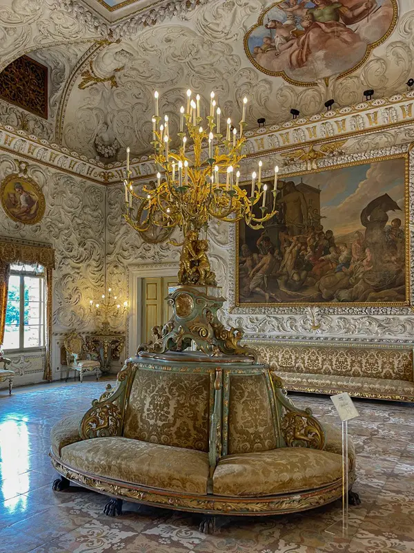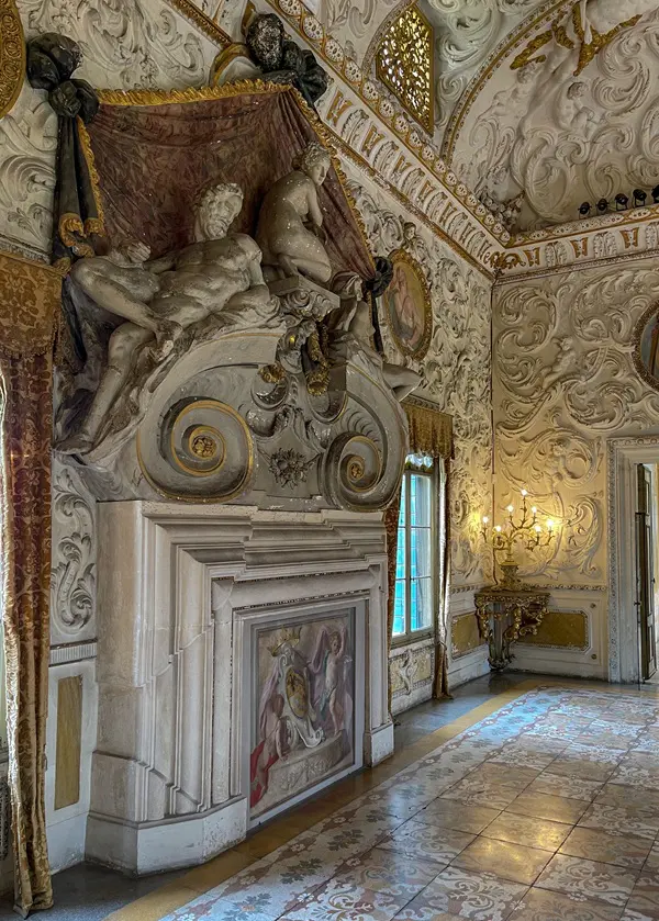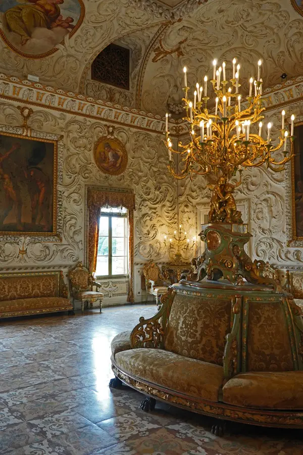 Daarna wacht de mooiste en indrukwekkendste zaal van de hele villa, de Sala da Ballo, de balzaal, met buitengewoon rijk stucco.