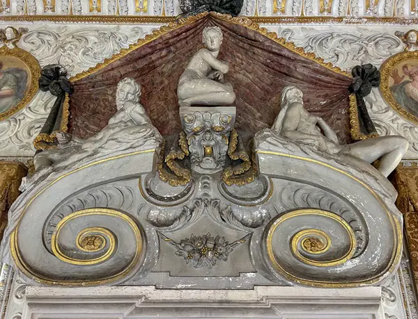 Een ander opvallend element in de zaal is de schouw met twee liggende figuren. Het is een imitatie van het werk van Michelangelo voor het graf van Lorenzo de’ Medici in de Sagrestia Nuova van de Cappelle Medicee in Florence.