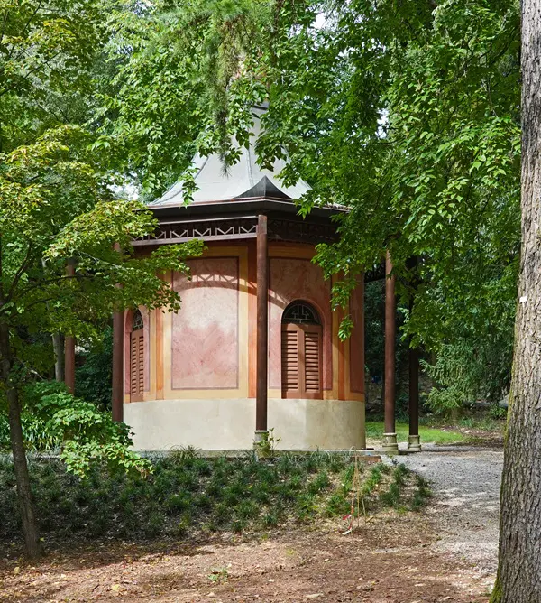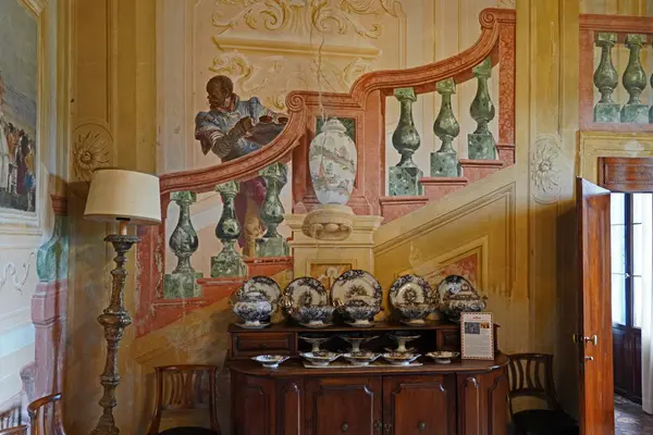 Het uitgestrekte landgoed kijkt uit over de uitlopers van de Monte Berico. Na een wandeling door de rozentuin bezoek ik eerst het hoofdgebouw, het palazzina, een van de drie gebouwen op het terrein, naast de foresteria en de scuderia. Via de statige trap kom je op het terras dat prachtig uitzicht biedt over de omgeving en een deel van het landgoed.
