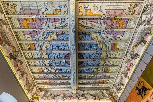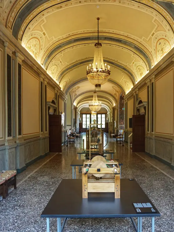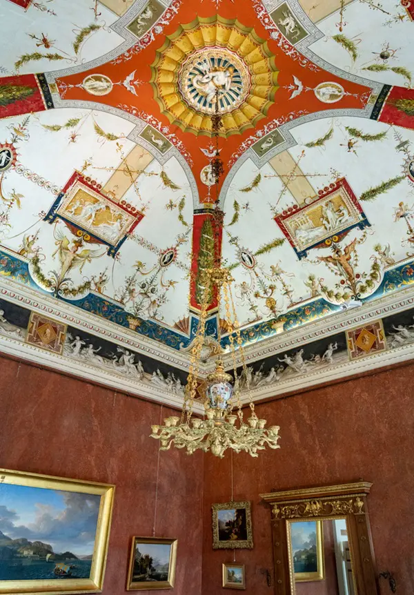 Het plafond in de Stanza delle Vedute is een meesterwerk van de Milanese kunstenaar Lodovico Pogliagh, een kleurenpracht, in neo-Pompeïaanse stijl. Kijk eens goed naar de kroonlijst onderaan, met zeefiguren. Het lijkt moeilijk te zeggen of het geschilderd is of reliëf is.